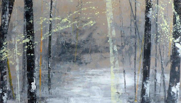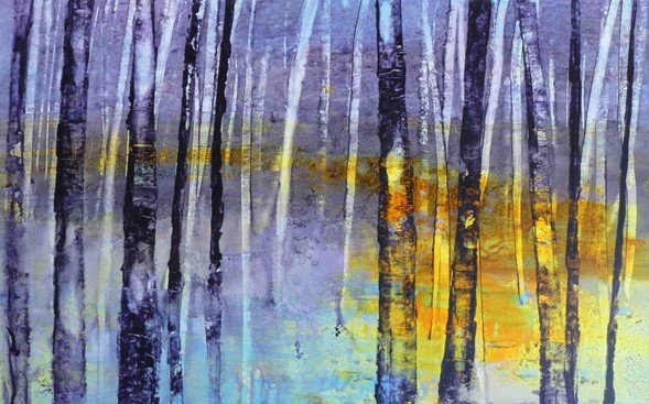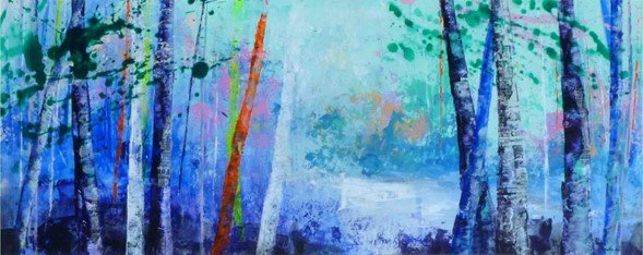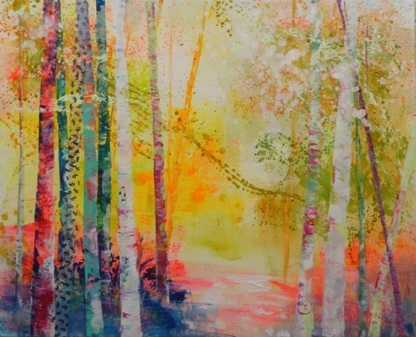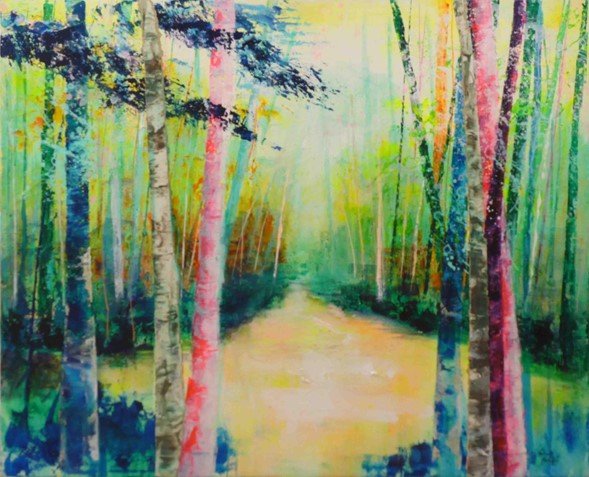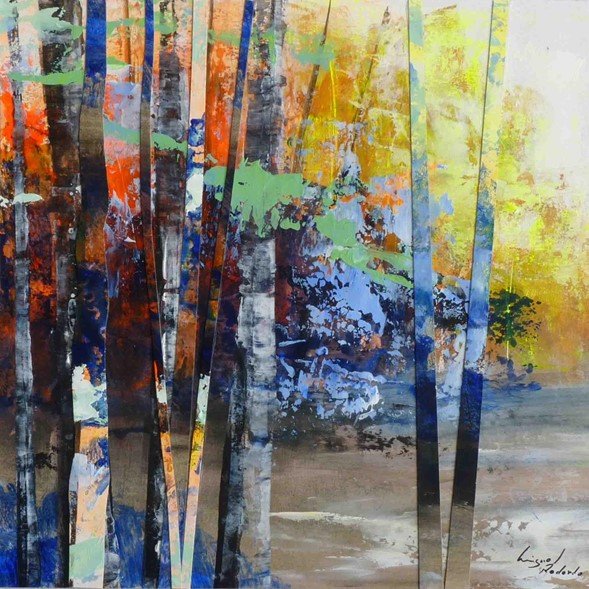 Al igual que con los peces, en estos momentos no pretendo pintar como en otras ocasiones, pinos, castaños, chopos o abedules. Es la forma y el color, a veces con collage, lo que llena el espacio. Es una mezcla de añoranza por sitios que he vivido y he sentido, lugares que ya no existen o que no sé ni dónde los imaginé. Muchos son reales, pero a mi manera.